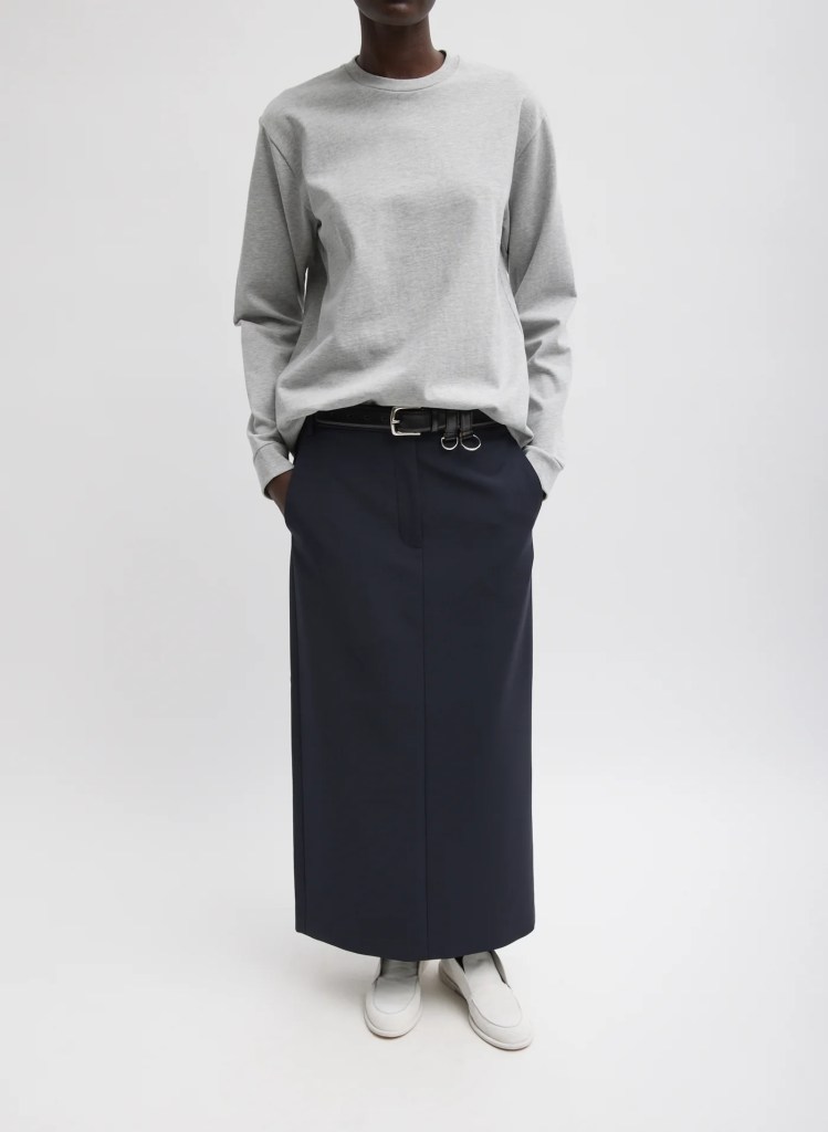 - The Look: Select a loose, slightly oversized blazer in a neutral tones like brown or navy worn with loose fit drawstring wide-leg trousers for an elevated “sweatsuit” look. Opt for a loose-fit sweater or sweatshirt worn with a straight skirt and brogues. You can also swap the skirt for loose-fit trousers, jeans (wide-leg) or elevated wide-leg joggers worn with a cashmere sweater, trainers, brogues or low-heel boots.